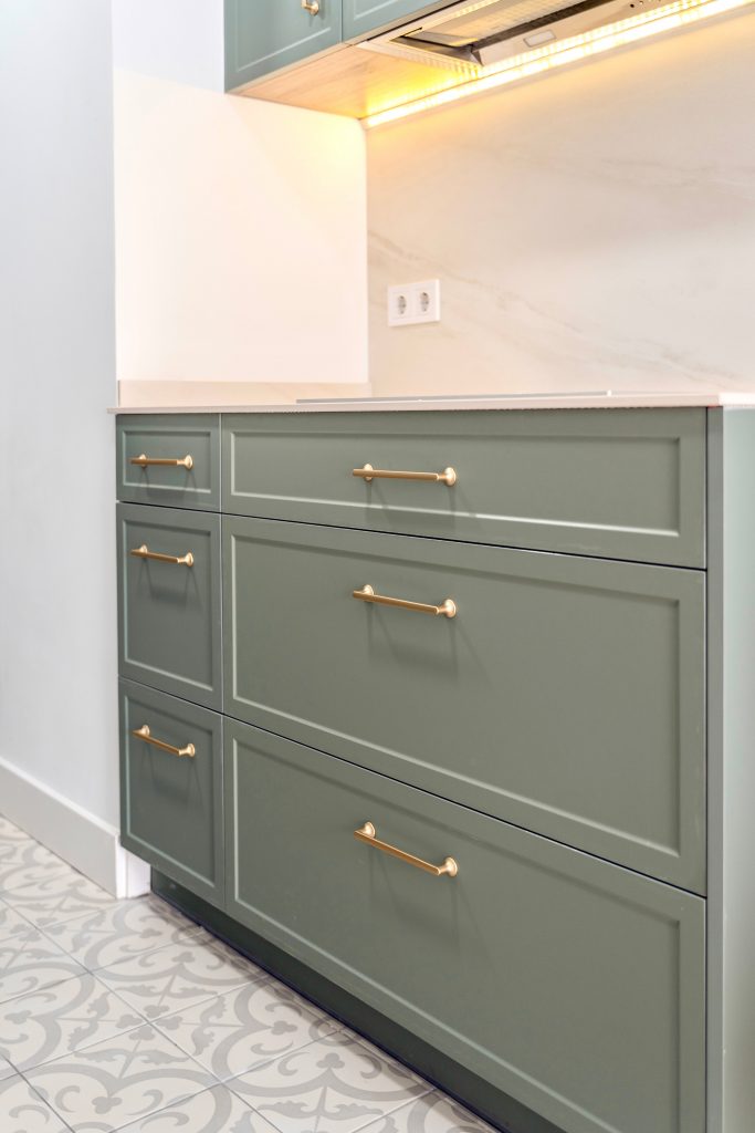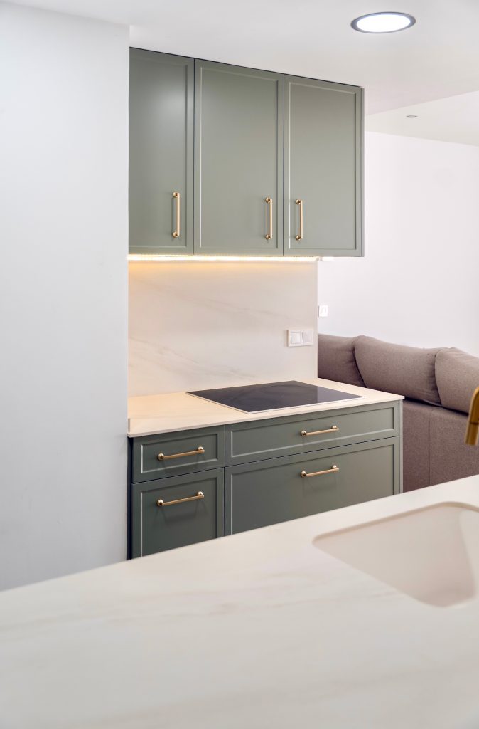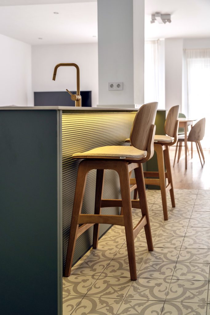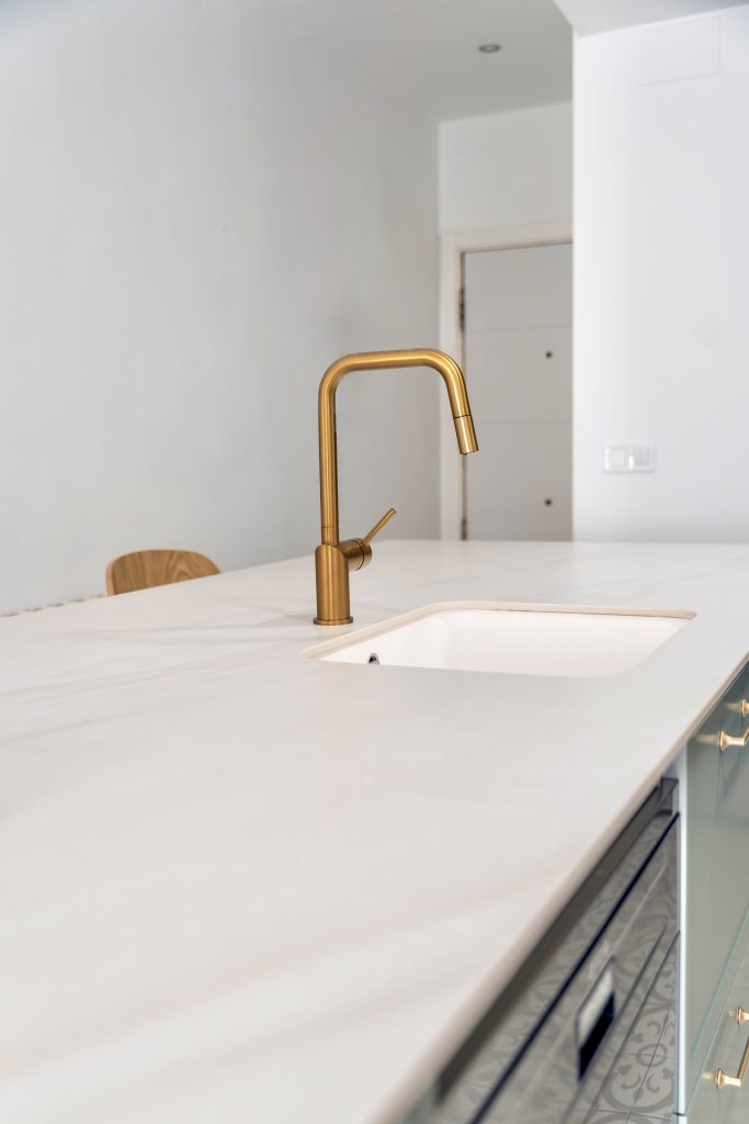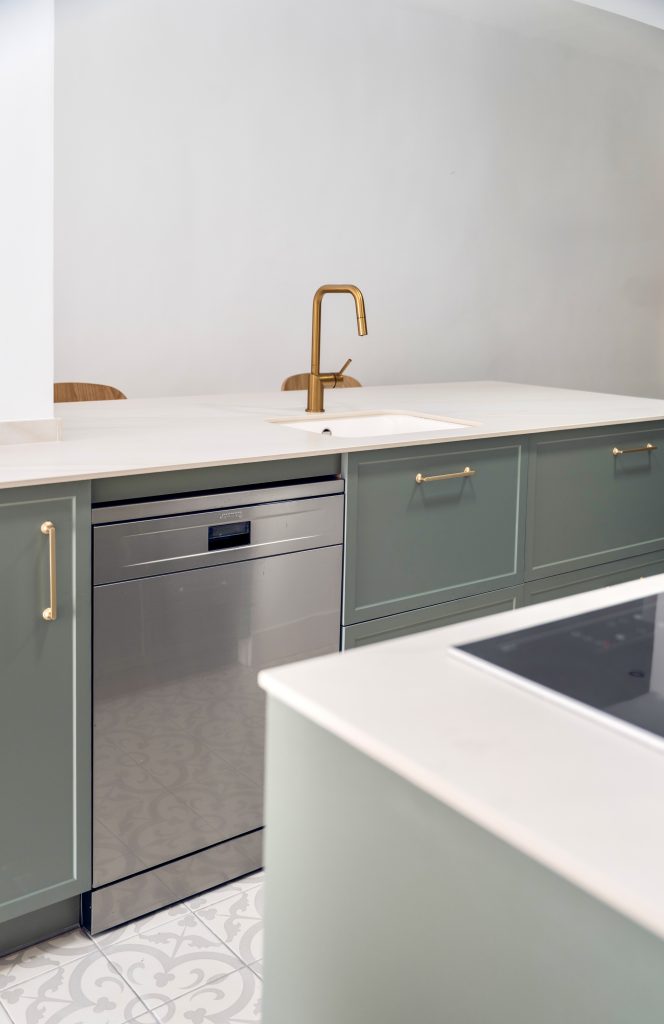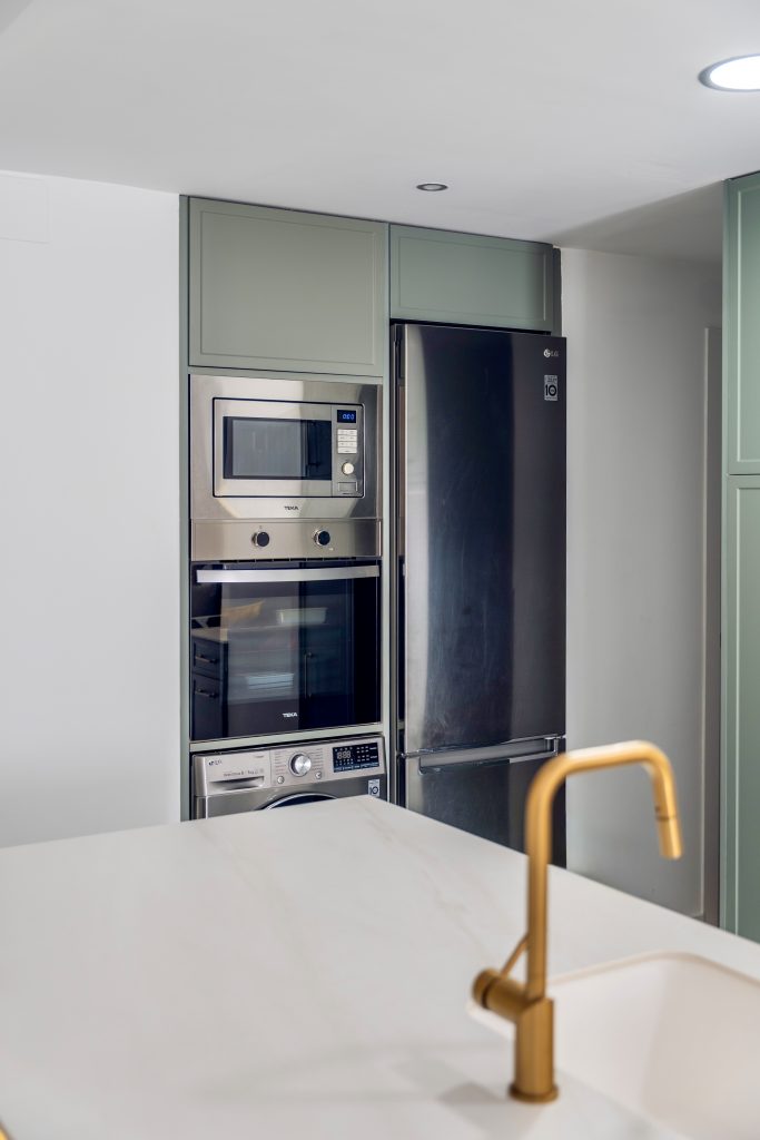 Sin mover la ubicación original, ampliamos la isla y eliminamos el peto trasero para ganar un cómodo espacio para taburetes. Apostamos por muebles en un elegante verde liquen con molduras y tiradores dorados, encimera porcelánica efecto mármol con sutiles vetas grises, electrodomésticos en acero inoxidable y un suelo hidráulico en tonos grises que enmarca y unifica todo el conjunto.