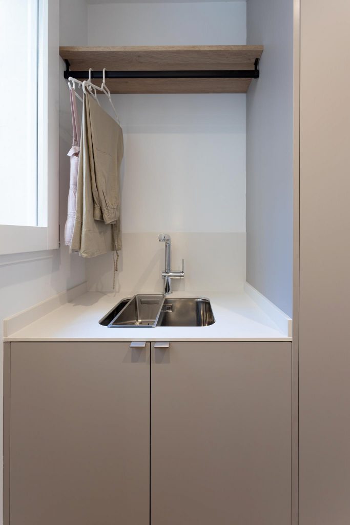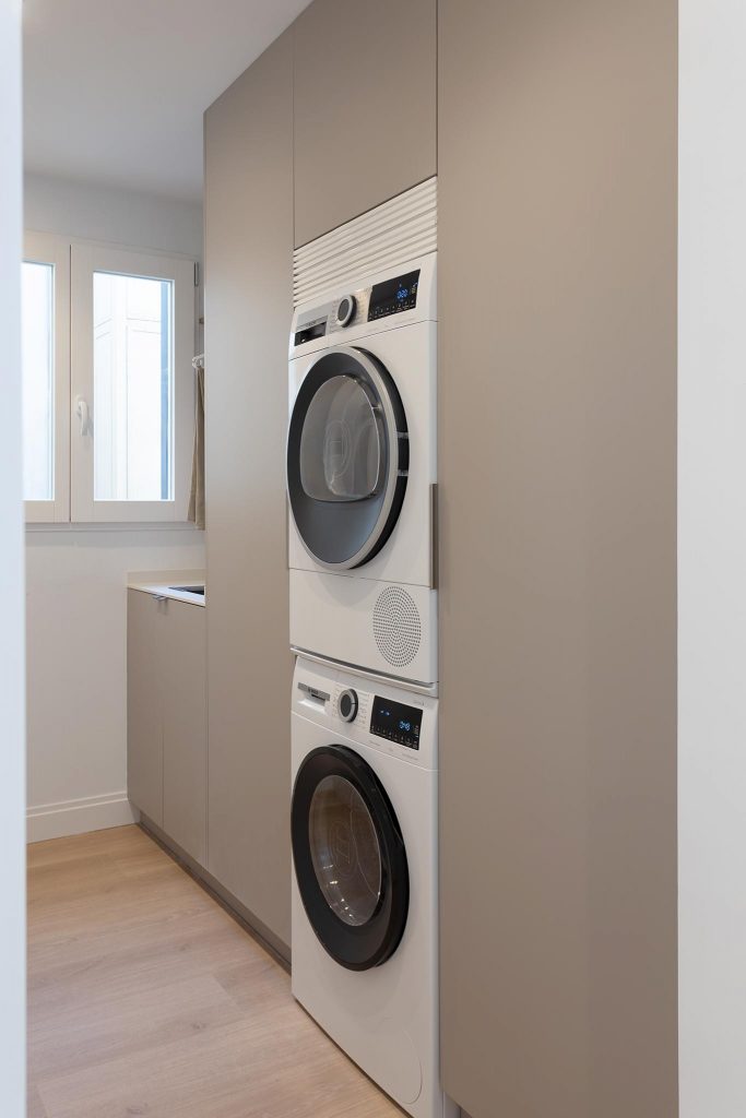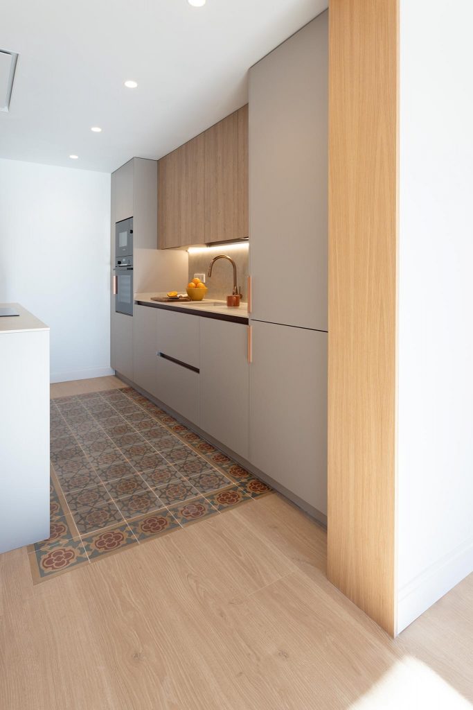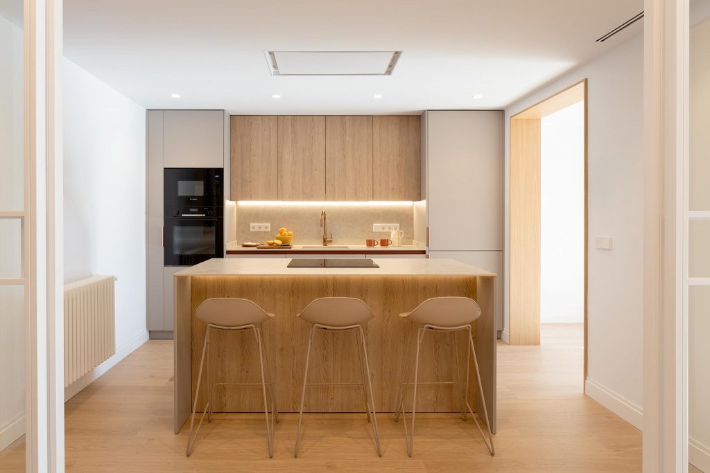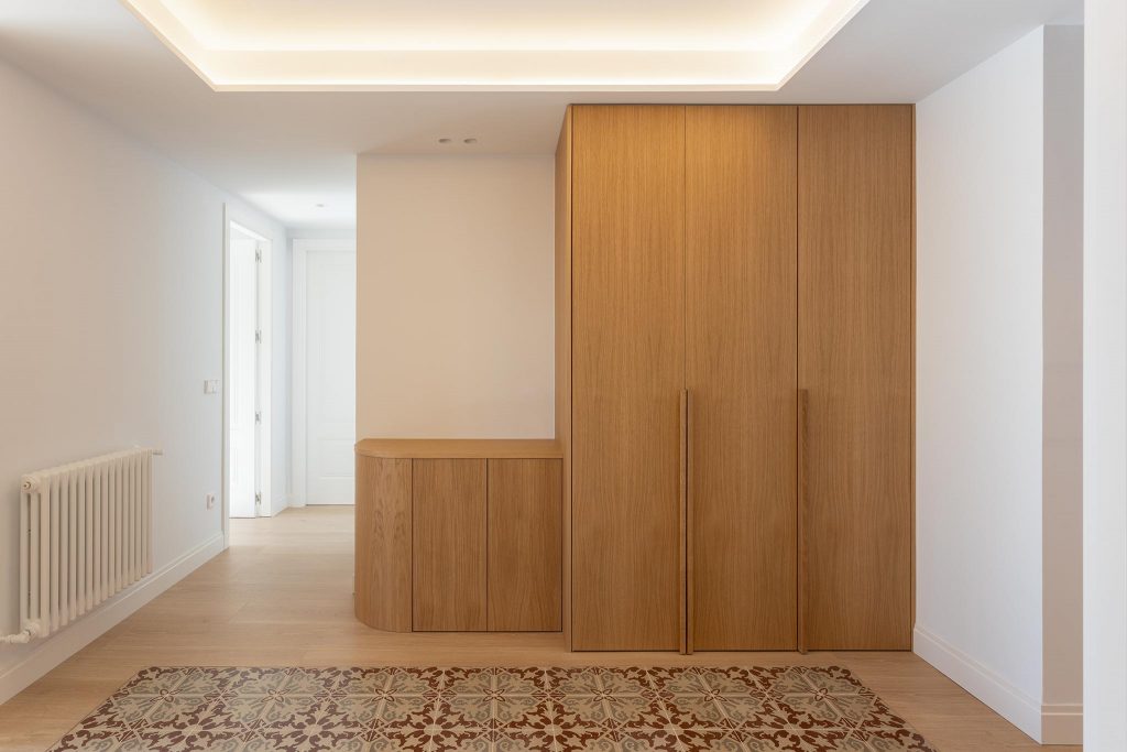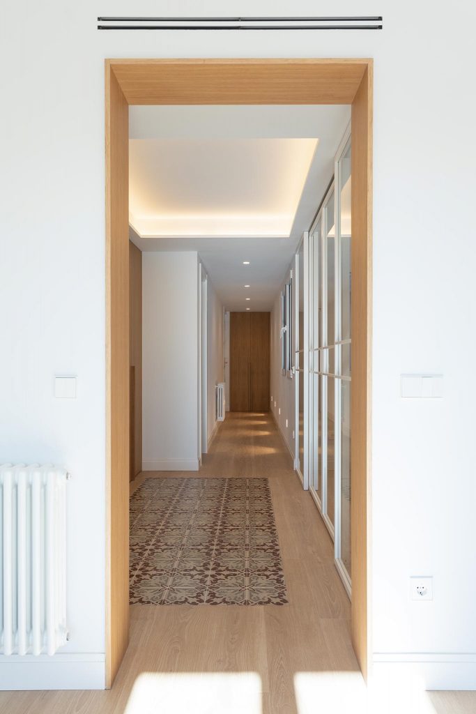 Gracias a una cuidadosa fase de proyecto se obtuvo una distribución mucho más práctica y eficiente, reduciendo al mínimo los pasillos y generando un nuevo recibidor, práctico y equilibrado, que enmarca visualmente una de las joyas de la vivienda: la cocina.